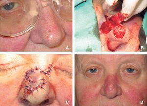 Figura 26. A. Carcinoma basocelular en punta nasal. B y C. Realización del colgajo bilobulado. D. Resultado al mes de la intervención.