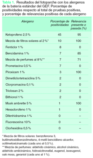 En la tabla 1 se detallan los fotoparches positivos con los alergenos de la batería estándar del GEF y en la tabla 2 los fotoparches positivos con otros alergenos que no están en la batería estándar.