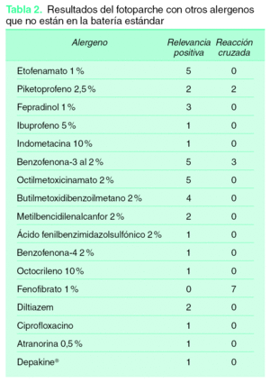 El ketoprofeno es el fotoalergeno más importante en nuestro país, y su relevancia fue casi siempre positiva, presente en 39 pacientes y pasada en 2. En dos casos más el fotoparche positivo al ketoprofeno se consideró como la expresión de una reacción cruzada. Se trataba de dos pacientes con sensibilización primaria a la benzofenona-3 (oxibenzona). Hubo, en sentido inverso, 11 fotoparches positivos a otras sustancias que se interpretaron como reacciones cruzadas con el ketoprofeno (sensibilizante primario), y concretamente al fenofibrato (7), a la oxibenzona (3) y al piketoprofeno (2).
