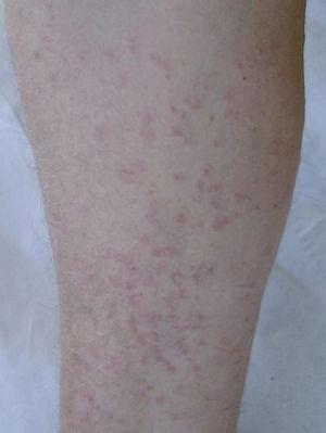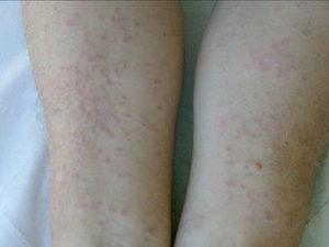 A la exploración se podían observar múltiples pápulas eritematosas, de pequeño tamaño (de 1 a 5 mm), diseminadas, con tendencia a confluir en placas, algunas de ellas con patrón anular o arciforme (figs. 1 y 2). No se apreciaba descamación ni otro signo de afectación epidérmica. Las lesiones estaban distribuidas de forma simétrica en miembros y en menor medida tronco, estando respetadas la cabeza y las mucosas. No se palpaban adenopatías.