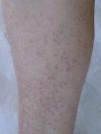 Fig. 1.--Múltiples pápulas eritematosas diseminadas de pequeño tamaño, confluentes en algunas regiones donde forman placas con patrón anular o arciforme.