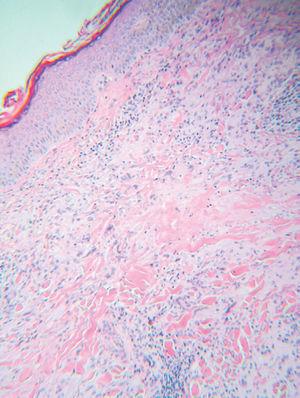 Un varón de 59 años, sin antecedentes personales ni familiares de interés, presentaba desde hacía 2 años lesiones cutáneas que se iniciaron en el dorso de las manos y fueron evolucionando de forma progresiva hasta afectar antebrazos, piernas y tronco. Las lesiones eran totalmente asintomáticas y no se acompañaban de fiebre ni otras manifestaciones sistémicas asociadas. Desde su aparición las lesiones habían permanecido estables.