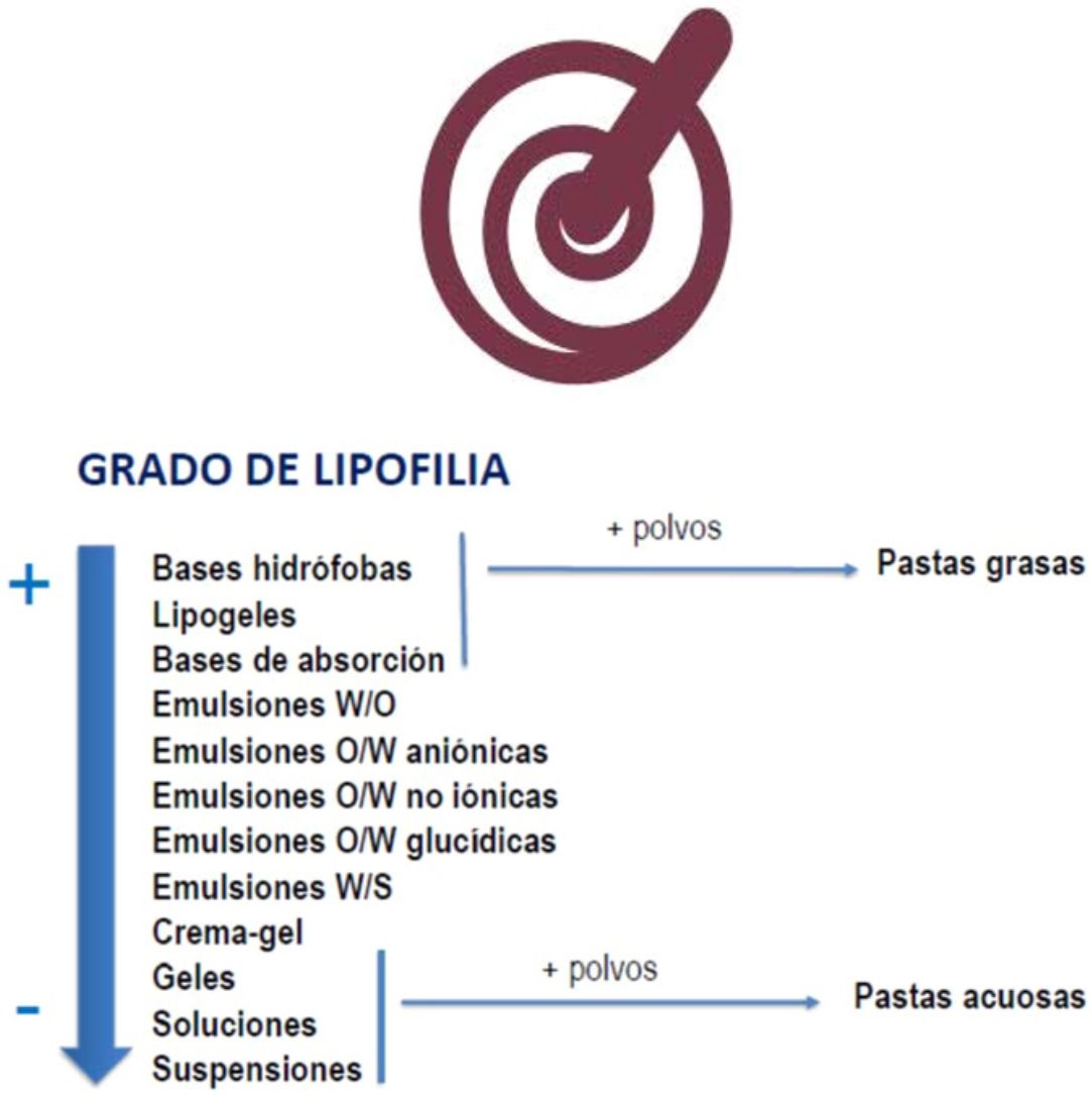 | Cierto contenido graso. Considerando el estado de la lesión, se sugieren formulaciones en emulsión O/W, loción O/W y pasta al agua (ordenadas de mayor a menor porcentaje de fase grasa), en función del grado de oclusión deseado | ||