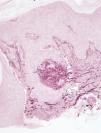 HistopathologyAnalysis of a skin biopsy specimen from the edge of a plaque revealed an acanthotic epidermis with hyperkeratosis, without the presence of intraepidermal neutrophils. Transepidermal elimination of dermal basophilic material was also observed (Fig. 2); orcein staining revealed that the material consisted of elastic fibers (Fig. 3).