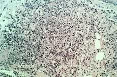 En el último ingreso se decidió pedir la opinión de nuestro Servicio, llegando al diagnóstico de síndrome de Sweet. Ante la presencia de anemia persistente y trombopenia se aconsejó realizar estudio de médula ósea que descartó la presencia de una neoplasia hematológica. Asimismo se decidió investigar nuevamente la posible recidiva del carcinoma de vejiga pero el paciente falleció por una insuficiencia cardíaca con edema agudo de pulmón tras una intervención de by-pass femoropoplíteo.