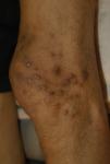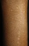 Clinical manifestations include pigmented and umbilicated dome shaped papules with a depressed and scaling centre, located on the extensor surfaces of the arms and legs and less commonly, on the scalp, trunk and buttocks (Fig. 2). Koebner phenomenon may be present. This condition appears in outbreaks and typically resolves in 6–8 weeks with residual pigmentation and scarring. Differential diagnoses include prurigo nodularis and lichen planus.24,26