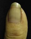 Lindsay nails (half and half). This condition is related to azotaemia. A white proximal area and a distal pink red-brown area that does not fade under pressure are observed (Fig. 6). No changes are noted with nail growth because the lesion is located in the nail bed. An increase in the number of capillaries in the distal nail plate and a deposit of melanin pigmentation in the distal area are observed. This condition resolves with renal transplantation.53