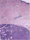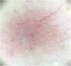 A 60-year-old woman with no medical history of interest was assessed for a painful lesion on the internal face of the left thigh. The lesion had been present for 2 years and had appeared spontaneously, with no apparent relationship with prior trauma. The patient reported pain on touch and pressure, but not spontaneously or with changes in temperature. She did not report any similar lesions in family members. Examination showed a macule with telangiectatic appearance, measuring 1.5cm in diameter, which was painful to palpation, and no other indications of dermal or epidermal involvement (Fig. 1). Dermatoscopy showed a small blue-grey poorly delimited structure immersed in an extensive fine network with a reticular configuration (Fig. 2). The lesion was resected, and histopathological study showed a solid, well-delimited nodule, measuring 6mm, located in the hypodermis, formed of monomorphic, rounded cells with oval nuclei, without atypia, that surrounded dilated vessels with thin walls. The cells expressed actin in smooth muscle and endothelial markers in vessels. In the papillary dermis, vessels were observed with dilated lumens, but without glomus cells nearby (Fig. 3). The diagnosis was of a solitary glomus tumor.