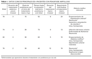 En los meses posteriores tratamos a otros 3 pacientes que recibían prednisona oral por penfigoide ampolloso generalizado (manifestaciones clínicas que cumplen los criterios del grupo francés de estudio de las enfermedades ampollosas 5,6, ampollas subepidérmicas en la biopsia, e inmunofluorescencia directa positiva). Todos presentaban enfermedades asociadas que aumentaban el riesgo de la corticoterapia sistémica. En la tabla 1 se describen sus edades, duración del tratamiento con prednisona y comorbilidad. Durante el tratamiento presentaron complicaciones graves por los corticoides, que nos llevaron a suspenderlos a un ritmo rápido (5 mg cada 10 días, y más lentamente una vez alcanzada una dosis de 10 mg/día) y sustituirlos por 20 g/día de propionato de clobetasol al 0,05 % por vía tópica. Ninguno de los pacientes presentó signos de empeoramiento durante la retirada de los corticoides sistémicos, o efectos secundarios relevantes por los corticoides tópicos, incluyendo nuevos signos de toxicidad sistémica por esteroides. El tratamiento tópico se mantuvo de 5 a 12 meses y los pacientes fueron seguidos posteriormente por periodos prolongados sin que presentasen recurrencias.