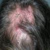 Case Description 3The patient was a 69-year-old woman who presented with a crusted tumoral growth on her scalp that had appeared 6 weeks earlier. She had received no prior topical or systemic treatment. Physical examination revealed a crusted lesion on the back of the head. The crust concealed fleshy exophytic granulation tissue. Fungal culture was positive for T tonsurans. Eight weeks after oral treatment with terbinafine (250mg/day) was initiated, there was still some evidence of scarring alopecia but no signs of inflammation, desquamation, or traction hair loss.
