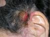 Case Description 4The patient was a 72-year-old woman who presented with a 3-week history of 2 crusted, inflammatory lesions on her scalp. She had completed a 3-day treatment with topical corticosteroids and oral cloxacillin. The perilesional erythema had resolved but the rest of the lesion had not improved. The patient had no fever or other symptoms. Physical examination revealed one crusted lesion on the left parietal-temporal region of the scalp (Fig. 3) and another on the forehead. The crust was removed from the lesion on the forehead, revealing an eroded surface with suppuration at various points. Regional lymph nodes were enlarged and palpable.