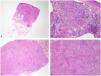 A biopsy was obtained from the eyebrow and another one from the back of her hand. Histopathological examination of both samples revealed the presence of granulomas composed of epithelioid histiocytes and multinucleated giant cells (fig. 2). These non-caseating granulomas had a scant lymphocytic rim, leading to their classification as sarcoid granulomas. A brownish pigment was observed in the eyebrow in the cytoplasm of some histiocytes in the papillary dermis, but not in deeper areas. No foreign bodies were found under polarized light, and no microorganisms were identified after multiple stains (Ziehl-Neelsen, Grocott, PAS, and Warthin-Starry).