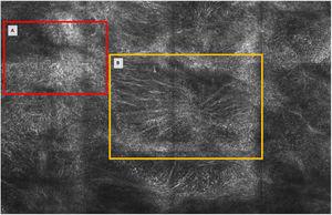Examination by confocal microscopy showed an epidermis with abundant dendritic cells and numerous junctional thickenings at the dermoepidermal junction (Fig. 3). The lesion was excised and histologic examination confirmed a diagnosis of extrafacial lentigo maligna (LM).