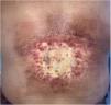 A 57-year-old man was referred to dermatology for assessment of a hyperpigmented sclerodermiform plaque measuring 30 × 20cm in the form of an exudative ulcer with indurated borders surrounded by a poorly defined erythematous area. The plaque was located on the lower back and had first appeared 5 months previously (Fig. 1). The patient had a personal history of type 2 diabetes mellitus and arterial hypertension and had recently been diagnosed with myelolipoma. This was treated with superselective embolization of the right phrenic artery, right suprarenal artery, and L2 lumbar artery 6 months before attending the clinic. The patient reported having initially experienced pruritus and reddening of the dorsolumbar region some 15 days after the operation. The lesion subsequently began increasing in size and became ulcerated. Histology only revealed enlarged lymph nodes caused by radiotherapy (Fig. 2).