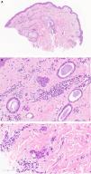 (A) Punch biopsy showing a benign ductal epithelial proliferation, localized only in the superficial dermis. Surrounding stromal fibrosis is observed, as well as an inflammatory infiltrate with a perivascular and perianexial pattern (H&E, panoramic view). (B) At higher magnification, the lesion consists of nests and ducts formed by 1 or more layers of small cuboidal cells, without atypia (H&E ×20). (C) Occasionally, they may adopt a tadpole-like pattern (H&E ×50).