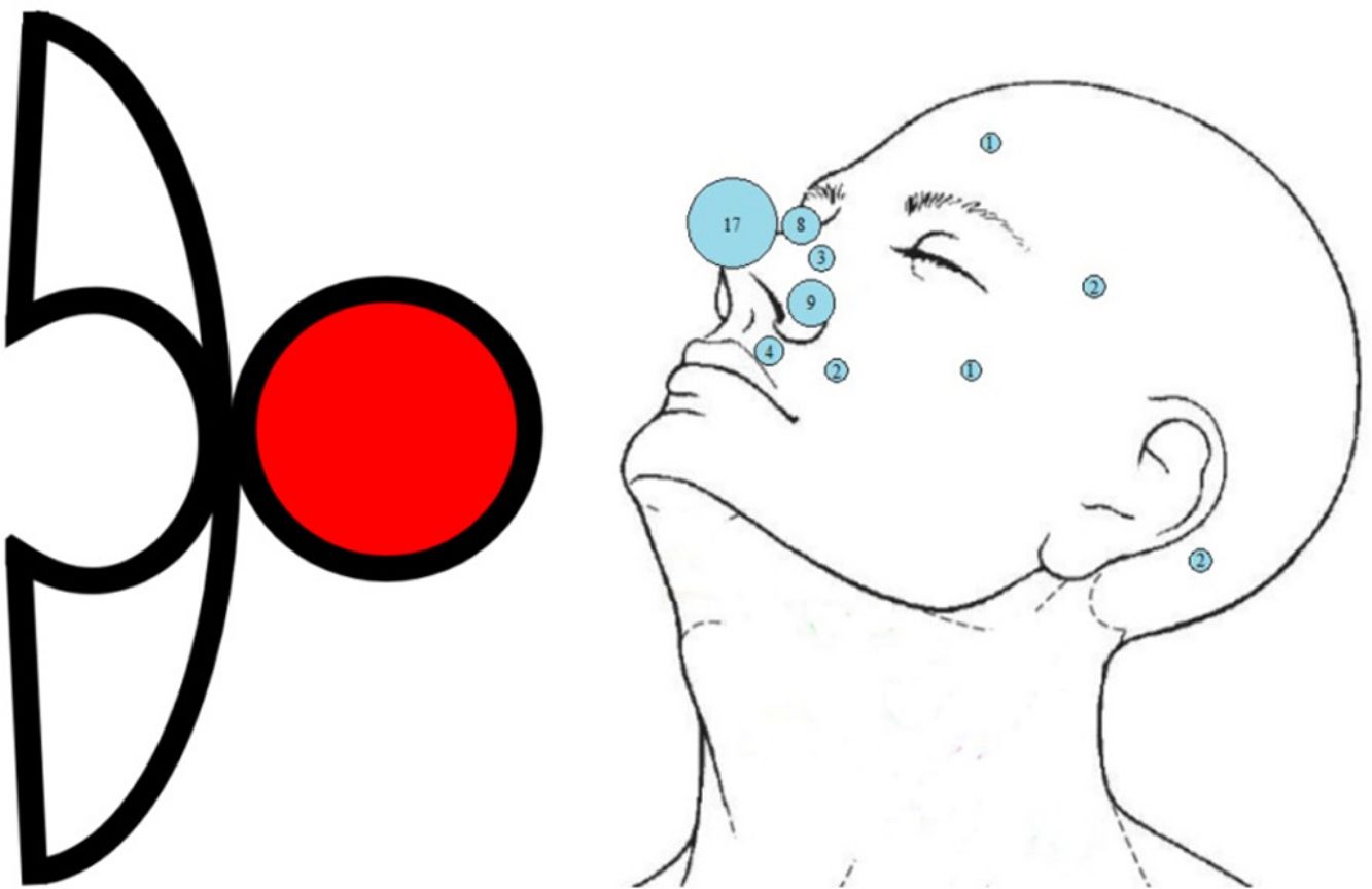 Regarding tumor location (Fig. 1), the nose predominated: 14 tip (40%), 7 ala (20%), and 2 sidewall (6%). In addition, 3 cases involved the nasogenian (nasolabial) fold (8%) (Fig. 2) and 2 the retroauricular area (6%); 1 case occurred in the malar region and 1 in the temple (3% each). Five cases (14%) were found at extrafacial sites.
