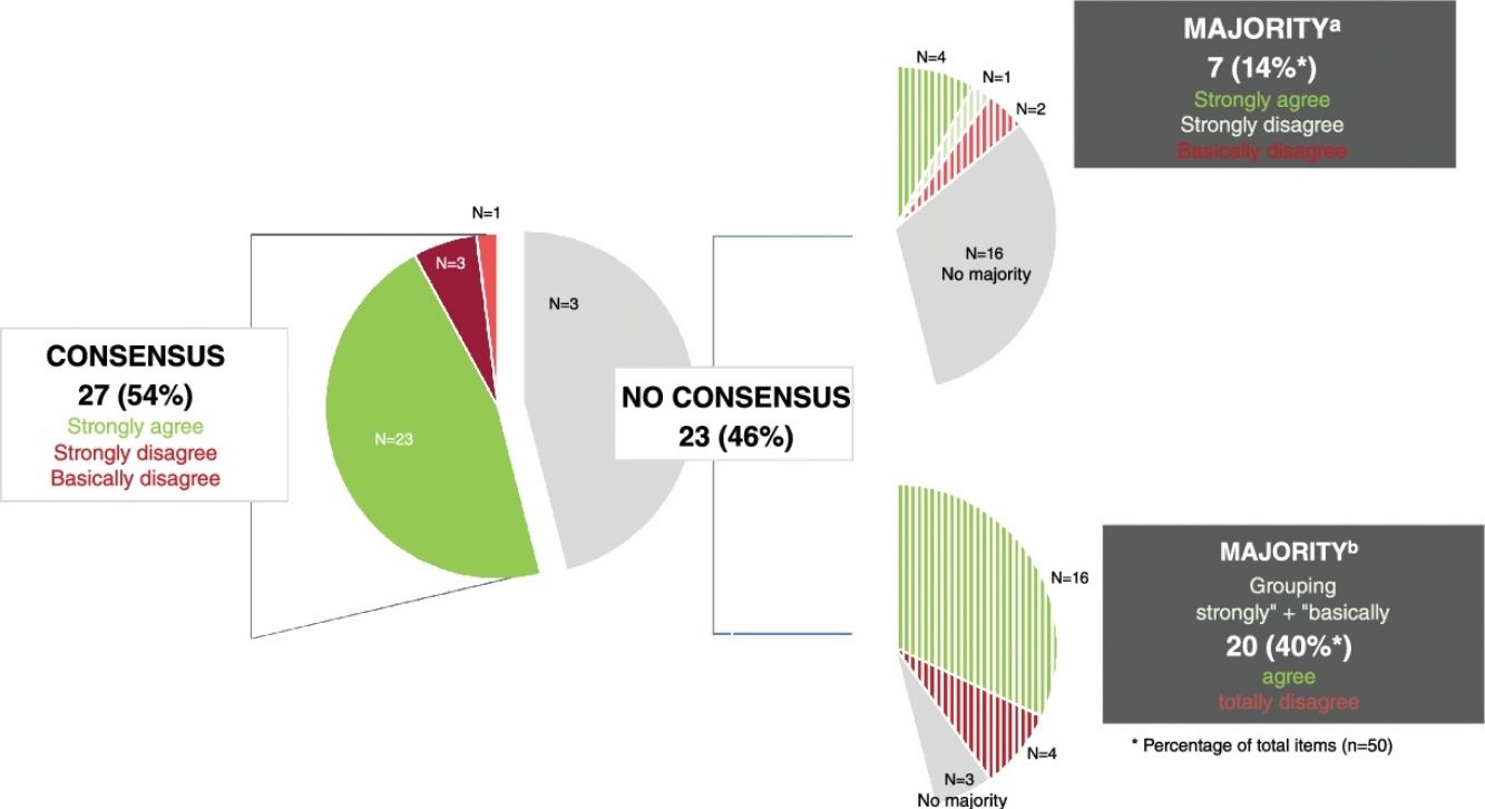 Analysis and interpretation of resultsThe results of each item were presented as the percentage of responses in each of the 4 categories. Consensus was defined as ≥70%, and majority agreement as 60–70% (same criteria for both rounds).