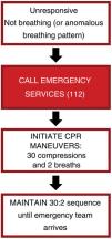 Basic Cardiopulmonary ResuscitationBasic CPR (Fig. 1) should be initiated in any person who “is unresponsive, with absent or abnormal breathing”, and it should be remembered that slow and labored breathing (agonic breathing) must be considered a sign of cardiac arrest. In the case of an unresponsive patient with a breathing pattern that would be considered normal, the patient should be placed on their side in the safety position (regarding pregnant women, always on the left side), remembering to assess breathing continuously.