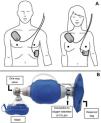 If an oxygen source and self-inflating bag (commonly known by its initials AMBU, for air mask bag unit) connected to a face mask is available, respiration should be carried out using that device connected to the oxygen supply with the rotameter set at 15 liters per minute (maximum oxygen) and, if possible, with a reservoir bag (Fig. 2B). Instrumental CPR with a self-inflating bag can be complicated if only one resuscitator is present. If personnel are available, it is recommended that one resuscitator seal the mask with two hands and the other, who is performing the chest compressions, squeeze the bag during the pause for ventilation.