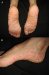 Una mujer de 49 años de edad, con antecedentes de atopia y alergias a diversos AINE, acudió a nuestra consulta por presentar, desde hacía 5 años, un eczema en ambos pies que había sido tratado con emolientes, corticoides tópicos de alta potencia y varios ciclos de corticoides orales con mejorías discretas (fig. 1). El eczema le producía un prurito constante asociado a dolor que a veces le impedía el sueño, ocasionando en alguna ocasión bajas laborales.