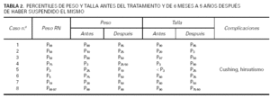 En la tabla 2 se recogen los datos del peso al nacer y peso y talla antes del inicio del tratamiento y en la última visita de seguimiento, entre 6 meses y 5 años después de haberse suspendido el tratamiento con corticoides. Tres pacientes presentaron bajo peso (p < 10) en el momento del nacimiento. Sólo en un paciente (paciente 2) se registró una disminución en la curva de talla hasta niveles inferiores a P10, aunque dicho paciente fue diagnosticado por el servicio de Endocrinología de nuestro hospital de déficit de hormona del crecimiento, que también estaba presente en un hermano sano del paciente.