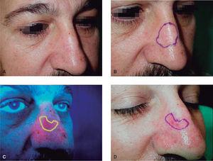 Figura 2. A. Carcinoma basocelular en dorso nasal. B. Márgenes clínicos. C. Márgenes por fluorescencia. D. Reducción de la zona de extirpación.