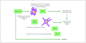 Figura 1. Mecanismo de acción del imiquimod. IFN-α: interferón α; IFN-γ: interferón γ; TNF-α: factor de necrosis tumoral α.