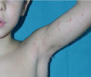 Fig. 2.Vesiculación de las lesiones de molusco contagioso tras la aplicación de cantaridina.