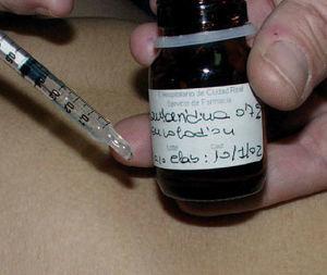 Fig. 3.Aplicación de cantaridina con una jeringa de insulina.