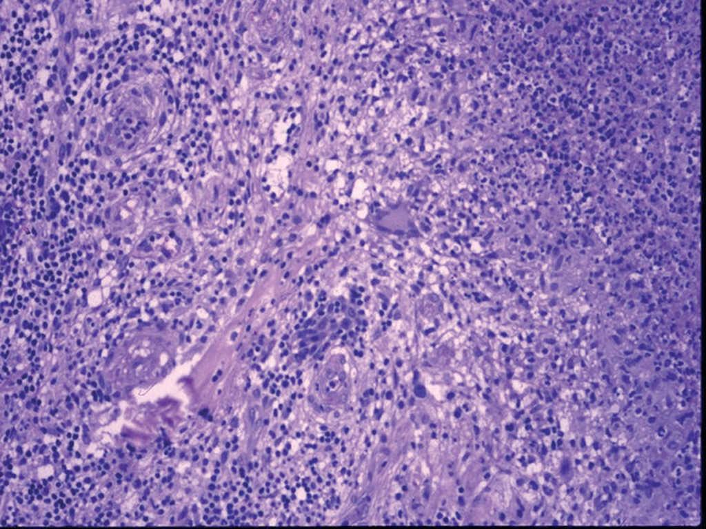 Fig. 3.--Foco granulomatoso en la periferia lesional. (Hematoxilina-eosina x400.)