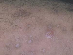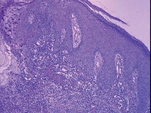 Un varón de 23 años, con antecedentes de dermatitis atópica y pie cavo bilateral corregido quirúrgicamente presentó un antecedente de un Mantoux positivo en 1995. En ese momento se instauró quimioprofilaxis con isoniazida, pero se tuvo que suspender al cabo de pocas semanas debido a una elevación grave de las transaminasas. El paciente presentó en 1999, un exantema varioliforme en la cara anterior de ambos miembros que se diagnosticó de foliculitis y fue tratado con doxiciclina con mejoría moderada. Al cabo de 9 meses presentó un episodio similar, pero en esta ocasión la evolución fue desfavorable, por lo que se remitió a nuestro servicio. En la primera consulta dermatológica se apreciaba una erupción diseminada, más o menos simétrica en miembros, con lesiones polievolutivas, pápulas, pústulas, escaras y cicatrices (fig. 1). La biopsia cutánea mostró una vasculitis granulomatosa necrosante (fig. 2), con focos granulomatosos con células gigantes (fig. 3). El cultivo micológico y bacteriológico de exudado y de material de biopsia fue negativo. La tinción de Ziehl fue negativa. La radiografía de tórax no mostró hallazgos patológicos. La bioquímica mostró una elevación moderada de las transaminasas. Finalmente, la PCR para micobacterias sobre material de biopsia resultó negativa. La prueba de Mantoux resultó necrótica. Se inició tratamiento con isoniazida 300 mg/día. A los 3 meses se suspendió el tratamiento por una elevación de transaminasas de cuatro veces sobre los valores básicos. En ese momento, la mejoría del cuadro había sido completa, y sólo se habían observado cicatrices varioliformes residuales en las piernas y las nalgas. En la última revisión de 2005 persistían las marcadas cicatrices residuales sin signos de actividad lesional reciente.