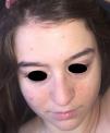 A 17-year-old adolescent girl, who was diagnosed with TSC at 9 years of age, was followed from birth for hypertrophy and combined vascular malformations of the left arm. The diagnosis of TSC was confirmed upon identification of the c.235G>T mutation in TSC2 in heterozygosis, in the absence of any clinical signs of the disease. The patient's mother carried the same mutation and presented clinical signs of TSC. A physical examination carried out during the first months of life revealed telangiectatic and purpuric vascular lesions (Fig. 1A) accompanied by multiple visible capillaries and venous vessels (Fig. 1B and C) on the left arm, the diameter of which was enlarged. No skin lesions indicative of TSC were observed. Doppler ultrasound performed at 20 days of age revealed no alterations of the arterial or deep venous systems. At 4 months of age, a deep skin biopsy, which included muscle, showed enlargement of the blood vessels in the dermis and subcutaneous tissue suggestive of capillary and venous malformations, in addition to ectasia of the lymphatic vessels. Immunohistochemistry revealed positive staining for D2-40 and negative staining for GLUT1 and WT1. No alterations in muscle tissue were observed, and atypia and mitotic figures were absent. Hypopigmented macules on the thighs, facial angiofibromas (Fig. 2), and periungual fibromas on the hands and feet became more evident once the patient reached 8 years of age, and were accompanied by Shagreen patches on the trunk that were compatible with TSC, which was confirmed by genetic study. A general physical examination and imaging techniques including conventional radiology, abdominal and pelvic ultrasound, brain magnetic resonance imaging, and cardiac ultrasound revealed no systemic alterations. The patient was diagnosed with predominantly lymphatic combined vascular malformation associated with TSC caused by TSC2 mutation. At age 11 years the patient began treatment with oral rapamycin (0.8 mg/m2/12 h) for 6 months. Because no decrease in the circumference of the affected arm was observed and the patient showed no systemic signs, rapamycin treatment was discontinued. Since the age of 14 years the patient's superficial capillary malformations have been treated with pulsed dye laser (PDL) (10mm, 10ms, 6J/cm2), and the superficial venous malformations have been treated with multiplex neodymium-doped yttrium aluminum garnet (Nd:YAG) laser (PDL [10mm, 10ms, 6J/ cm2] followed after a 1-s delay by Nd:YAG laser [10mm, 15ms, 70J/cm2]) (Fig. 3A and B).