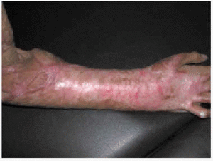 Fig. 1.--Importantes secuelas cicatrizales en la extremidad superior derecha, previa al desarrollo de sarcoidosis.