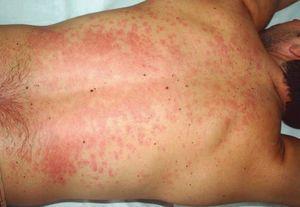 A estas descripciones cabría añadir el caso de un varón de 32 años, con diagnóstico de espondilitis anquilopoyética que había presentado una respuesta inadecuada a la terapia convencional. El Servicio de Reumatología inicia tratamiento con adalimumab en inyección subcutánea (en dosis de 40 mg cada dos semanas) con mejoría de su sintomatología. Tras la administración de la tercera dosis el paciente refiere inicio súbito de un prurito muy intenso en la región lumbar, acompañado de discreta sensación distérmica y malestar general, sin otra sintomatología asociada ni toma de ningún otro medicamento. El prurito posteriormente se extendió al resto del tronco y a la raíz de las extremidades superiores e inferiores. En la exploración física presentaba múltiples lesiones eritematoedematosas confluyentes en grandes placas en la espalda y la región anterior del tronco, y con elementos de menor tamaño en ambos flancos (fig. 1). Las lesiones eran descritas como evanescentes por el paciente. No se acompañó de dificultad respiratoria, edema de labios, lengua o párpados. Con el diagnóstico de urticaria aguda se indicó tratamiento con antihistamínicos y corticoides orales, con mejoría de la sintomatología y desaparición de las lesiones en unos días.