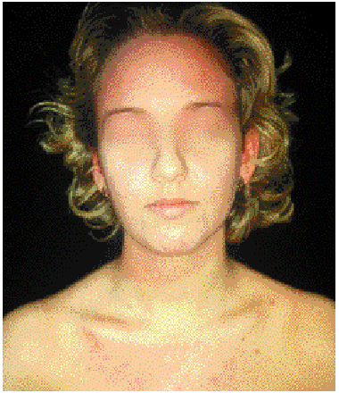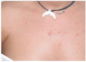 Mujer de 20 años con fototipo III, que acudió a nuestro hospital en noviembre de 2001 por presentar una erupción papulovesiculosa muy pruriginosa (fig. 3). Las lesiones estaban localizadas en cara, cuello y escote. Como único antecedente la paciente refería acudir de forma repetida a cabinas de bronceado, apareciendo la erupción 2 h después de acudir a una sesión. Por la morfología de las lesiones se sospechó una erupción lumínica polimorfa.