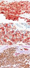 Though many of the common melanocyte specific markers are useful in the diagnosis of melanocytic lesions and primary melanomas,11,12 their expression may be lost focally or diffusely as the disease progresses, particularly in metastatic lesions. In addition, there might be acquired variable and aberrant expression of non-melanocytic markers such as cytokeratins, and neuroendocrine markers.13–15 This altered immunohistochemical profile may be accompanied by unusual tissue morphology as well. Therefore, one must exercise caution when examining a poorly differentiated neoplasm in a patient with prior history of melanoma. The following section will summarize commonly used diagnostic and prognostic markers of melanoma, not including the less commonly utilized markers such as PNL2, KBA.62, SM5-1, MC1R, NKI/C3, CSPG4 and CD146.5,16,17