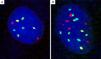 Four-probe FISH assay. (A) Normal cell with two signals each of 6p25 (RREB1, red), 6q23 (MYB, gold), 11q13 (CCND1, green), and centromere 6 (Cep6, aqua). (B) Melanoma cell with an abnormal FISH result with multiple RREB1 (6 red dots) and CCND1 signals (7 green dots), indicating gains at 6p25 and 11q13, respectively.