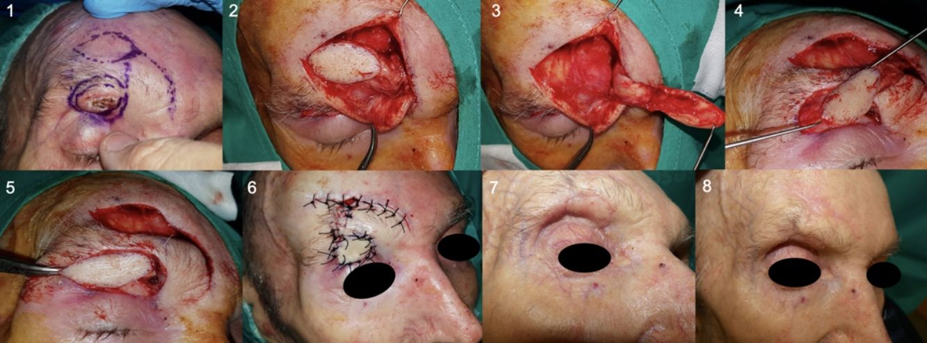 Realización de CIT supraciliar para reparar defecto subciliar (caso 1). 1: CBC ulcerado subciliar, se diseña extirpación con márgenes de 3mm y colgajo en isla de zona supraciliar. 2 y 3: labrado de la isla de piel y disección del pedículo subcutáneo. 4 y 5: tunelización de la zona interpuesta entre ambos defectos para posteriormente atravesar dicho túnel con el colgajo, llevando la isla de piel hasta el defecto original. 6, 7 y 8: resultado postoperatorio inmediato y a los 3 meses preservando la arquitectura ciliar y la funcionalidad del párpado superior.