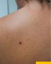 A 43-year-old woman with no relevant personal or family history of illness was referred by her primary care physician for evaluation of a pruriginous, violaceous lesion on the back of her trunk. The lesion had appeared 2 weeks earlier, and melanoma was suspected. She reported having noticed spontaneous bleeding from the lesion.