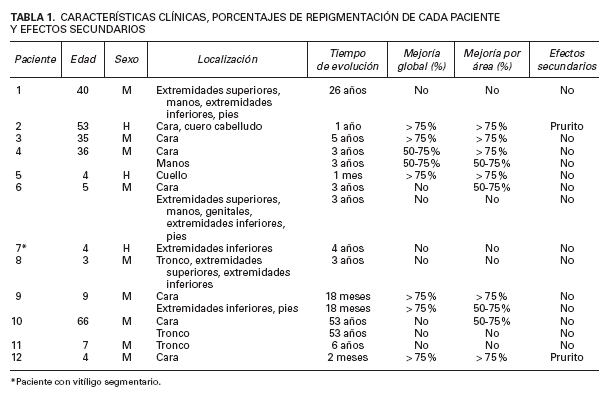 TABLA 1. CARACTERÍSTICAS CLÍNICAS, PORCENTAJES DE REPIGMENTACIÓN DE CADA PACIENTE Y EFECTOS SECUNDARIOS