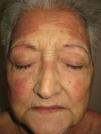 We report the case of a 67-year-old woman who presented with quinacrine-induced skin toxicity. At 32 years of age, the patient was diagnosed with systemic lupus erythematosus with both cutaneous and pleural manifestations, for which she was treated for many years with prednisone and chloroquine. Several years ago she was diagnosed with peripheral chorioretinal atrophy (retinitis pigmentosa) and chloroquine treatment was suspended. One year ago, upon reducing the prednisone dose from 30 to 15mg/day, the patient experienced an outbreak of erythematous lesions that affected the face (Fig. 1), trunk, and extremities. A skin biopsy revealed orthokeratotic hyperkeratosis, epidermal atrophy, vacuolar degeneration of the basal membrane, loss of skin appendages, and chronic inflammatory interstitial and perivascular infiltrate. Analyses revealed an anti-nuclear antibody titre of 1/160 with a speckled pattern, anti-Ro/SS-A antibodies (124 U/mL), and anti-DNA antibodies (5 U/mL). Other examinations revealed no relevant findings and the patient was diagnosed with an outbreak of cutaneous lupus erythematosus. Topical tacrolimus (0.1%) was administered, but was not tolerated, and after analyzing serum levels of thiopurine methyltransferase the patient was treated with azathioprine at 50mg/day. After 4 months, azathioprine treatment was stopped due to general malaise and abnormal test results: erythrocyte sedimentation rate, 86mm/h; aspartate aminotransferase, 41 U/L; alanine aminotransferase, 59 U/L; gamma-glutamyl transferase, 1006 U/L; alkaline phosphatase, 240 U/L. The cutaneous lupus erythematosus persisted with no improvement, and as the patient did not wish to take more immunosuppressants, quinacrine for compassionate use was obtained from the hospital pharmacy service. After providing informed consent the patient began treatment with quinacrine (100mg/day) and prednisone (50mg/day). Two months later the lupus erythematosus lesions had completely resolved with no residual scarring, allowing a reduction in the dose of prednisone.