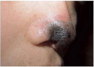 Fig. 1.--Necrosis cutánea de la punta de la nariz.