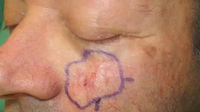 TechniqueWe describe the case of a 67-year-old patient with no past medical history of interest, who presented recurrence of a basal cell carcinoma affecting the malar region and left lower eyelid. Physical examination revealed a sclerotic, infiltrated plaque with poorly defined borders located in the upper left malar region, adjacent to the ala nasi and to the lower eyelid (Fig. 1).