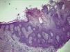 HistopathologyA skin biopsy was performed and histologic examination revealed pseudoepitheliomatous epithelial hyperplasia and chronic inflammatory infiltrate with no koilocytes, atypia, or mitotic figures (Fig. 2).