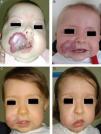 A, The hemangioma of this 2-month-old baby girl affected the parotid, cheek, and lip, with associated ulceration. B and C, Clinical response was highly satisfactory after 1 and 3 months of treatment with oral propranolol (2mg/kg/d). D, At the end of 9 months of treatment, there is redundant, atrophied tissue and slight deformity of the facial structure that can be treated with laser surgery.
