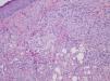 We report the case of a 56-year-old woman who presented with facial lesions that had appeared a month earlier. The patient's history included hepatitis C diagnosed in 2002, for which she had started treatment with pegylated interferon alfa-2b and ribavirin in October 2003. Three months after starting treatment she developed progressive facial edema, so the treatment was discontinued. During the following month the edema gradually remitted and violaceous nodular lesions appeared in the nasolabial folds and on the upper lip and forehead, coinciding with the areas injected with cosmetic filler material, including Artecoll (polymethylmethacrylate microspheres suspended in a 3.5% solution of collagen) 14 and 4 years earlier (Figs. 1 and 2). Skin biopsy revealed in the dermis the presence of epithelioid granulomas with multinucleated giant cells surrounding optically empty vacuolar structures of various sizes (Fig. 3).The following relevant results were observed in the blood tests: aspartate aminotransferase, 60 U/L; alanine aminotransferase, 79 U/L; angiotensin converting enzyme, 145 U/L (normal range, 0-115 U/L). A Mantoux test was negative and a chest radiograph normal. In the absence of other systemic symptoms, no more tests were performed. We established the diagnosis of sarcoidosis induced by interferon and ribavirin, with granulomas in the areas injected with filler material. The patient decided to discontinue the antiviral treatment definitively and the lesions regressed spontaneously in 6 months.