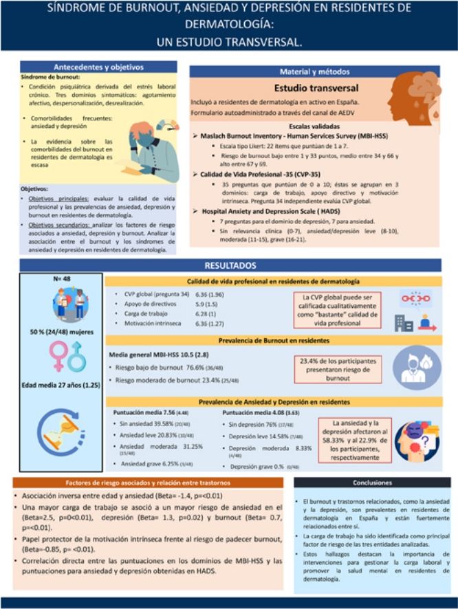 El síndrome de burnout es un trastorno de salud mental derivado del estrés laboral crónico. Tanto el burnout como las comorbilidades asociadas son prevalentes en profesionales sanitarios, siendo los médicos residentes un grupo vulnerable. Pese a ello, la literatura que analiza este tema en residentes de dermatología es escasa. El presente estudio tiene como objetivo analizar las prevalencias de burnout, ansiedad y depresión en residentes de dermatología, así como los factores de riesgo asociados.