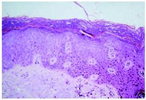 En la biopsia de la lesión se apreció una delimitación lateral brusca de la lesión con queratinocitos grandes uniformes, con citoplasmas amplios, en ocasiones vacuolizados en el estrato espinoso de Malpighio, así como un epitelio con ligera hiperqueratosis, acantosis y aumento de pigmento melánico de la capa basal (fig. 4). En la dermis superficial se observaron algunos melanófagos y amplias áreas de elastosis. Se aconsejó fotoprotección y se aplicó crioterapia en la lesión.