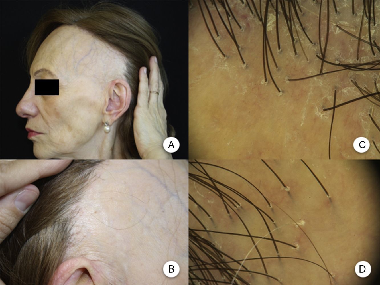 Manifestaciones clínicas en la alopecia frontal fibrosante. A. Se observa recesión de la línea de implantación frontotemporal del cabello, que se extiende a la región retroauricular. B. La piel de la zona alopécica presenta cambios cicatriciales en su superficie, con pérdida de los orificios foliculares, palidez uniforme y visualización de la red vascular. C. Imagen con tricoscopia de la línea de implantación frontal del cabello, en la que se observa ausencia de los ostium foliculares, eritema, descamación perifolicular y capilares ramificados. D. Imagen con tricoscopia de la región retroauricular en la que se observan cambios similares a la anterior.