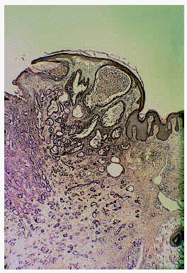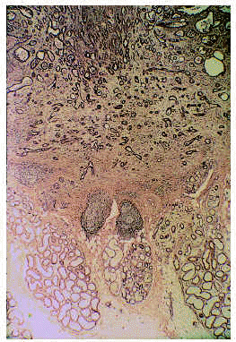 Fig. 2.--Tumor exofítico compuesto por múltiples luces tubulares, algunas de las cuales contactan con invaginaciones epidérmicas remedando un siringocistoadenoma papilífero (H&E x20).